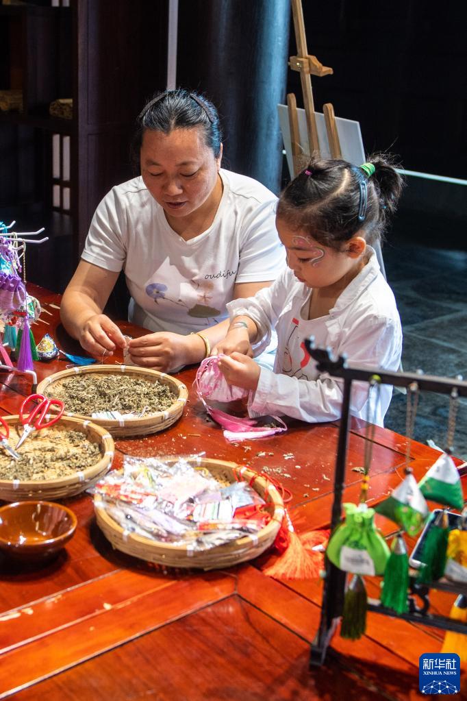 6月22日,游客在湖南省岳阳市汨罗市屈子祠镇屈子文化园制作香囊。