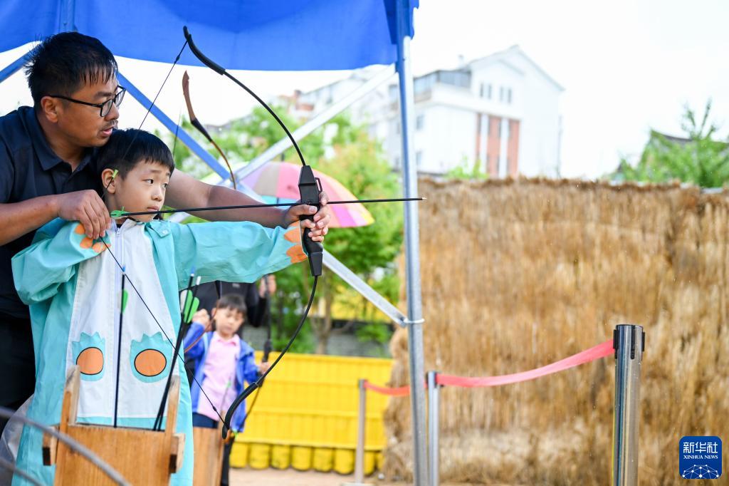 6月22日,游客在位于吉林省延边朝鲜族自治州延吉市的中国朝鲜族民俗园体验射箭。
