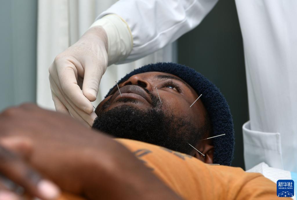 6月21日,纳米比亚首都温得和克卡图图拉医院中医诊疗室,纳米比亚市民萨洛莫因面瘫问题第五次接受针灸治疗。新华社记者 陈诚 摄