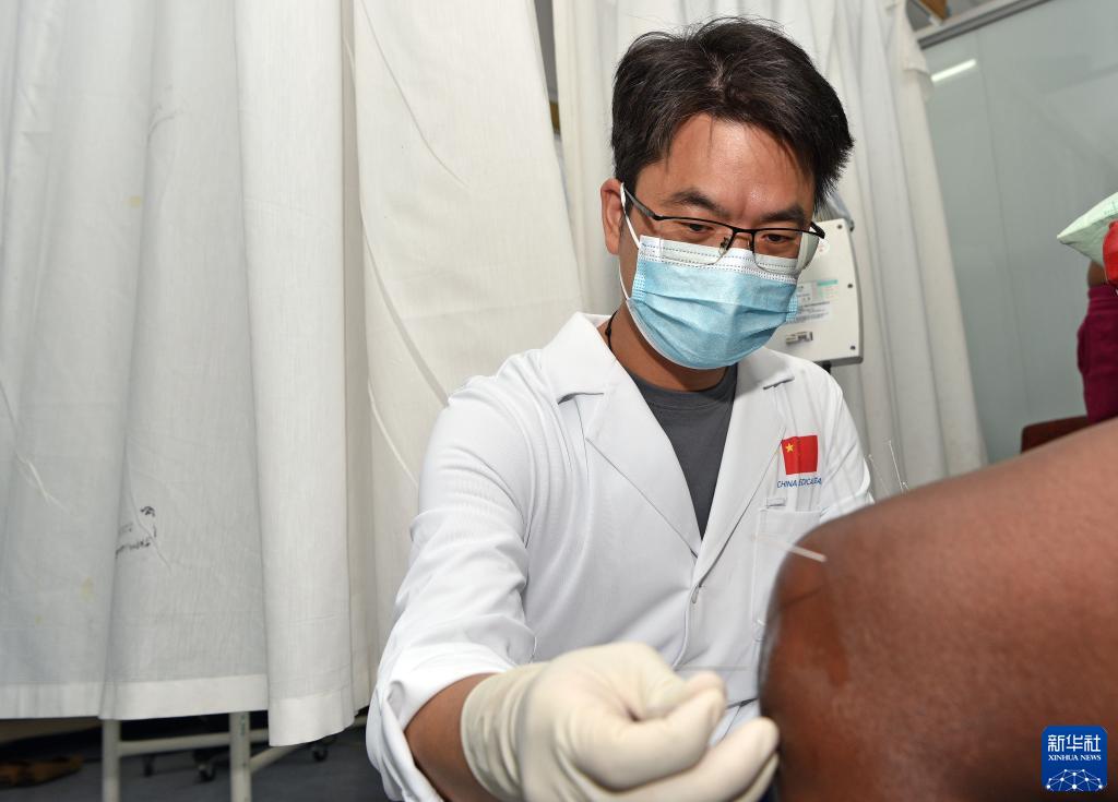 6月21日,纳米比亚首都温得和克卡图图拉医院中医诊疗室,医生给患者治疗。新华社记者 陈诚 摄