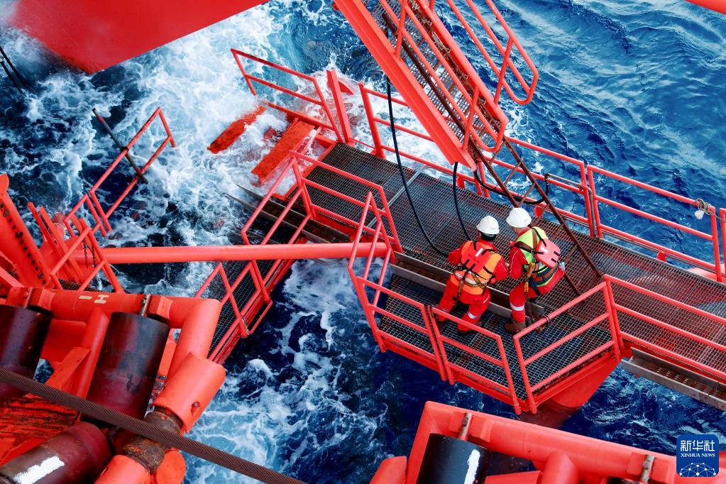 6月22日,施工人员在巡查海管入水情况。新华社发(韩庆摄)