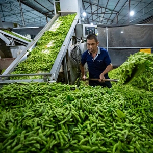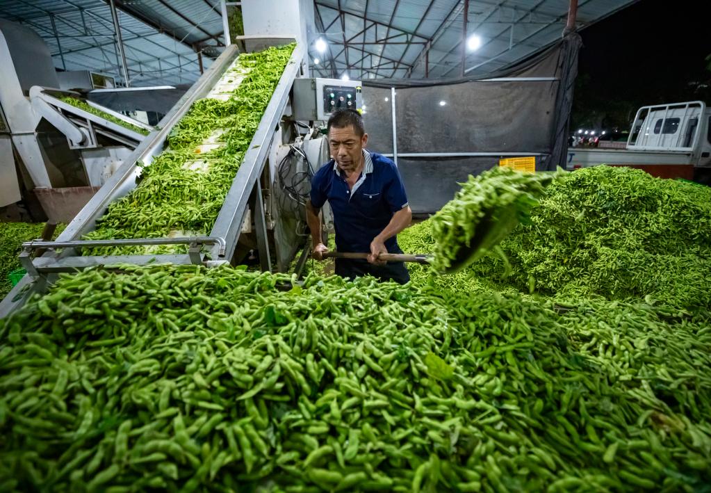 工人将运来的新鲜毛豆装上清洗、挑选流水线。新华社记者沈伯韩 摄
