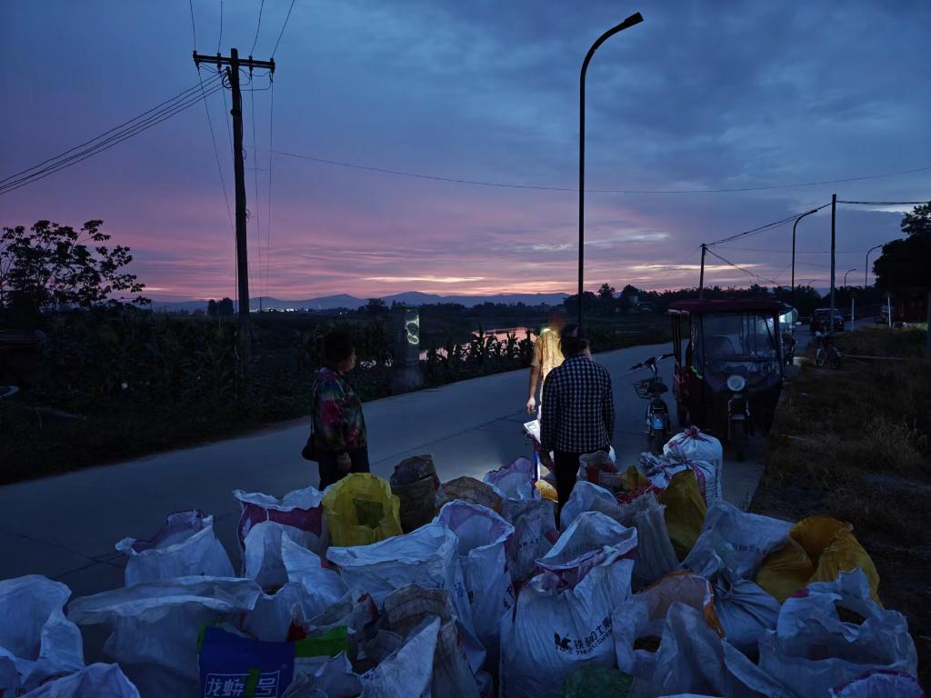 清晨5点30分,双堰社区抢收现场的路边,堆满了装满毛豆的编织袋。新华社记者谢佼 摄