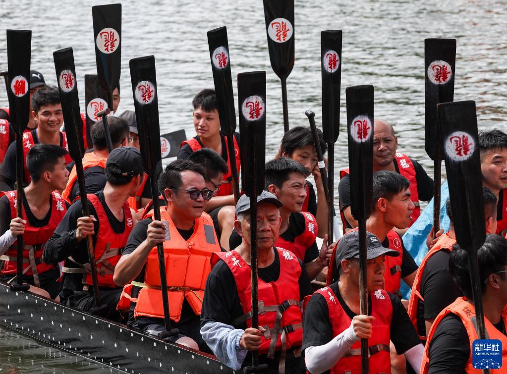 6月22日,在一条到广州荔枝湾泮塘五约探亲招景的龙船上,“扒仔”(桨手)们举起船桨。