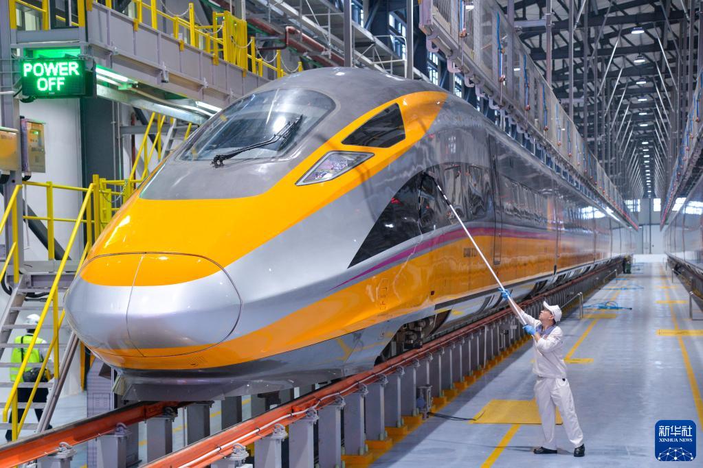 6月21日,在印度尼西亚万隆雅万高铁德卡鲁尔动车所,工作人员擦拭清洁综合检测列车。
