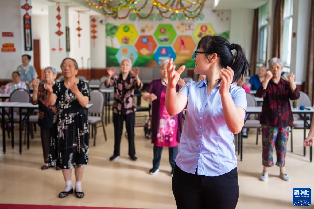 6月20日,工作人员(前)带领老年人在汉寿县社会福利中心跳舞。