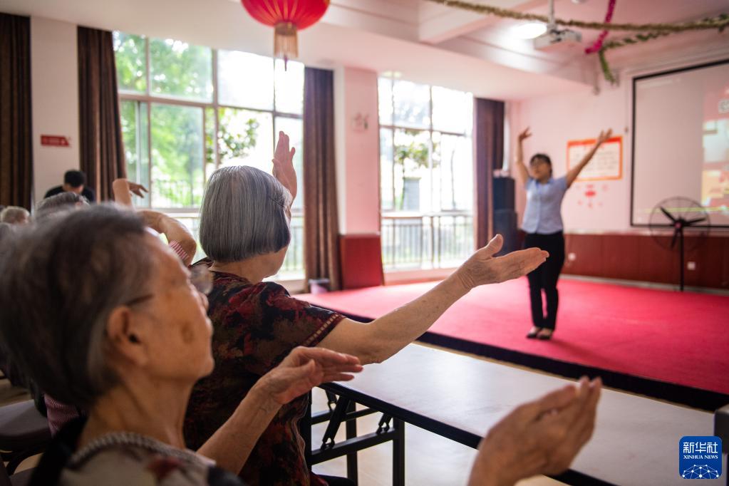 6月20日,工作人员(右一)带领老年人在汉寿县社会福利中心跳舞。