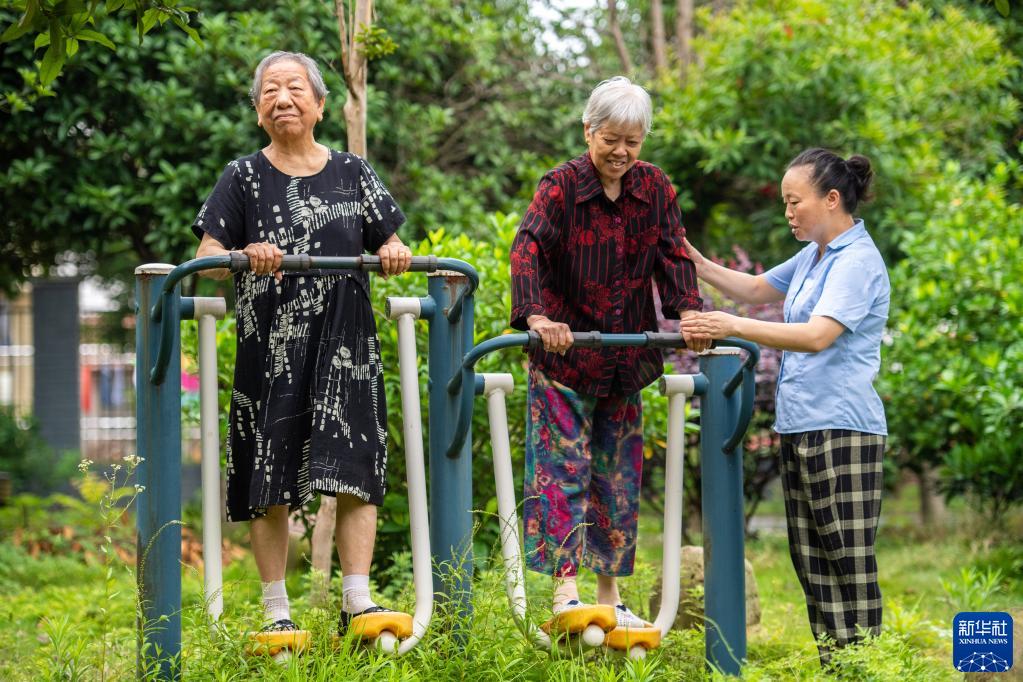 6月20日,工作人员(右一)辅助老年人在汉寿县社会福利中心健身。