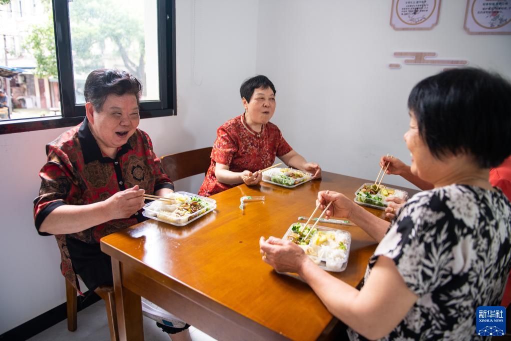 6月20日,老人们在汉寿县龙阳街道城东社区日间照料中心吃午餐。
