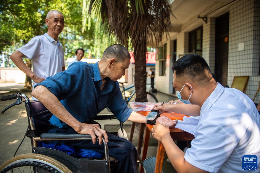 6月21日,医护人员(右一)在安乡县深柳镇官陵湖敬老院为老年人体检。