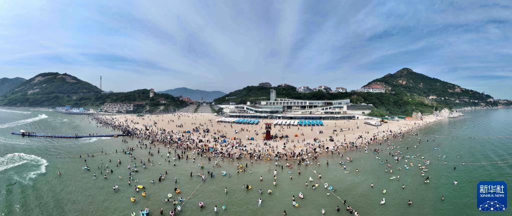 6月23日,游客在江苏省连云港市连岛大沙湾海滨浴场戏水纳凉(无人机全景照片)。