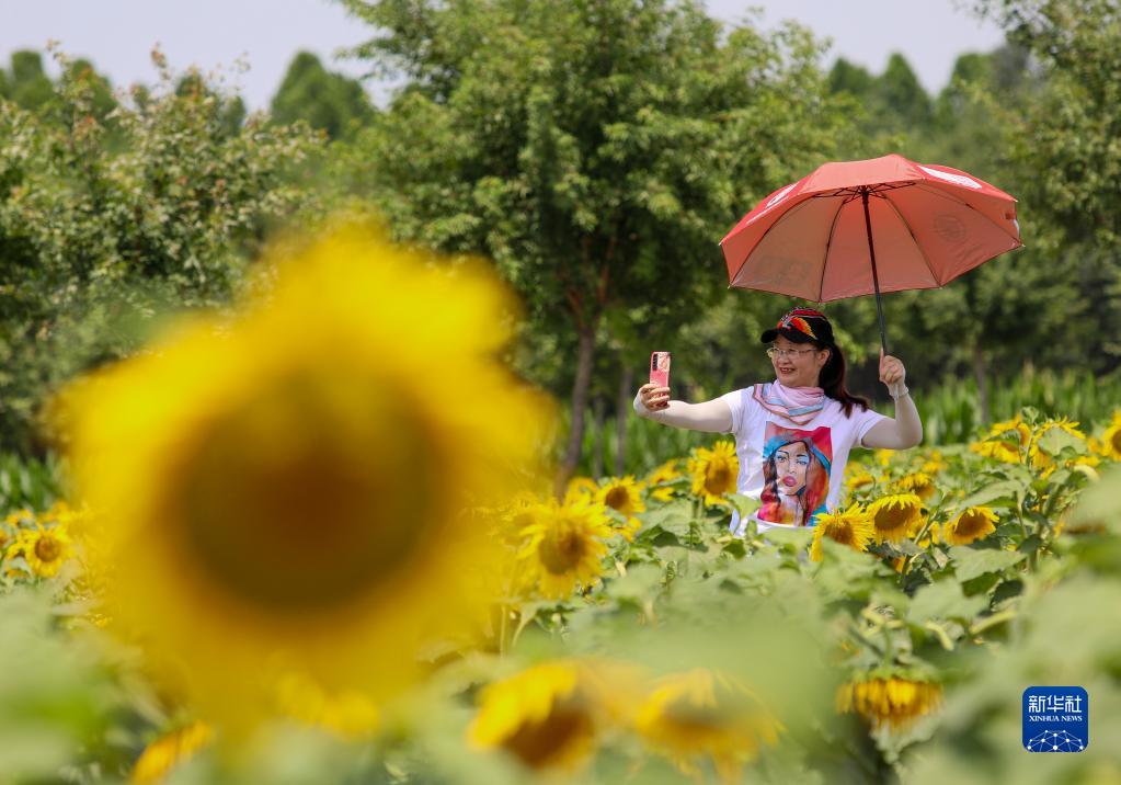 6月23日,游客在山东省滕州市张汪镇大宗村向日葵基地游玩拍照。