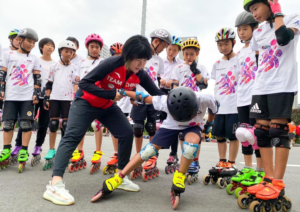2020年6月23日,在长春体育中心,冬奥会短道速滑冠军周洋(前左)指导长春市冬季运动管理中心小运动员们技术要领。新华社记者许畅摄