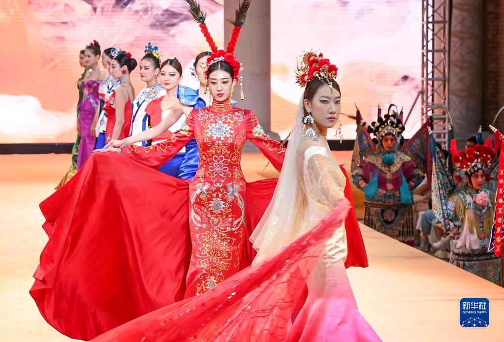 6月22日晚,在新疆国际大巴扎景区,模特在京剧《定军山》演出同时展示时装。