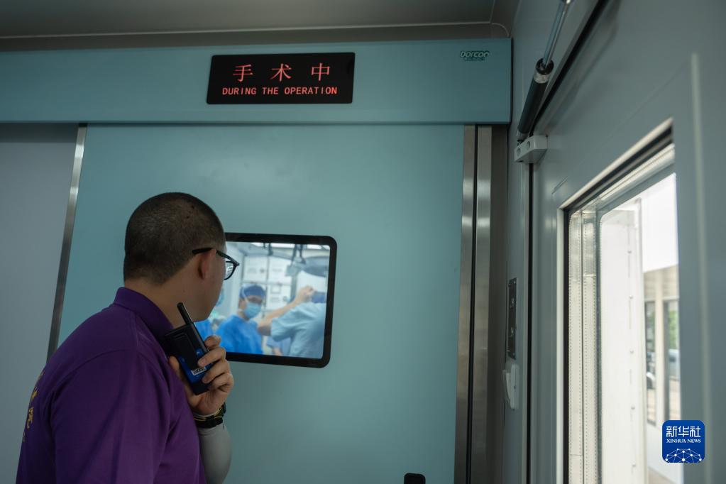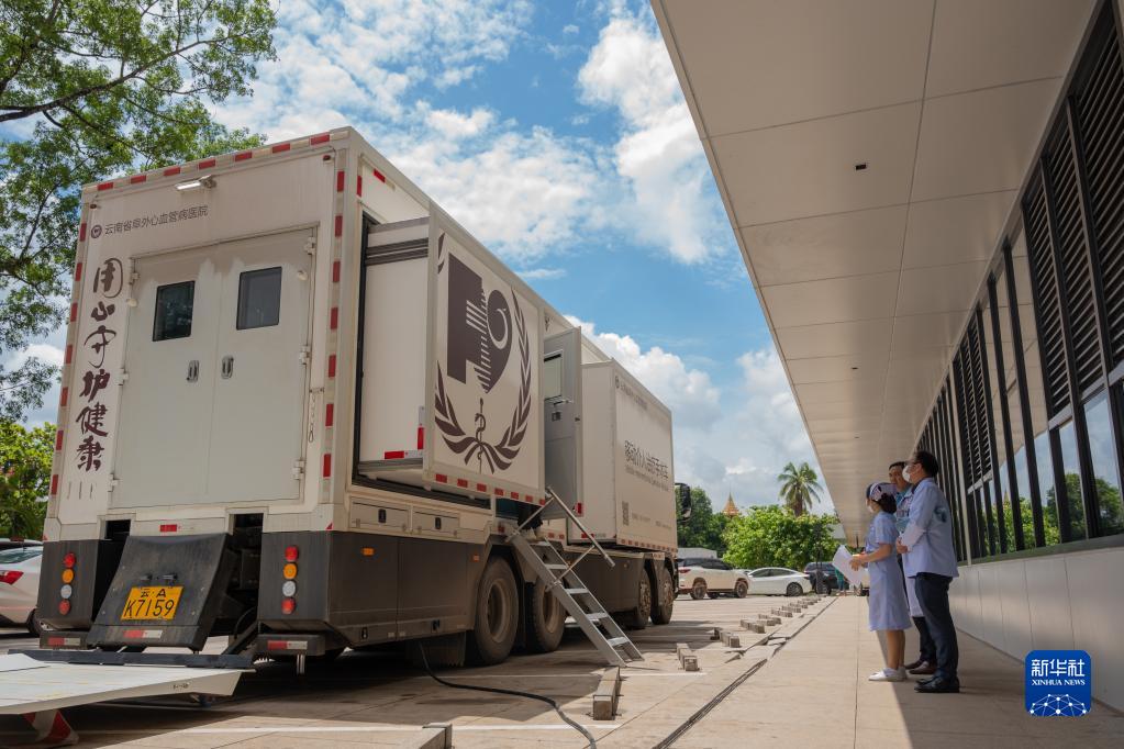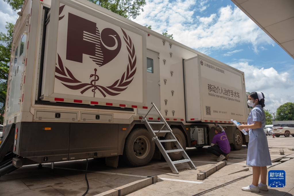 6月20日,在老挝首都万象玛霍索医院,中国医生在移动介入治疗手术车上进行治疗。新华社发(凯乔 摄)