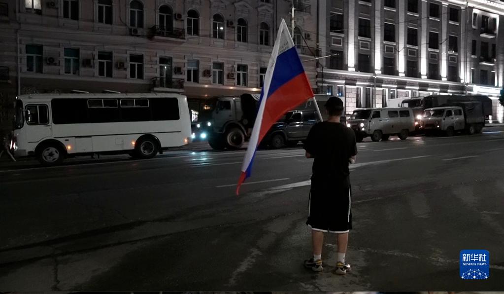 6月24日,在俄罗斯顿河畔罗斯托夫,军用车辆编队驶过(视频截图)。新华社发(弗拉基米尔摄)