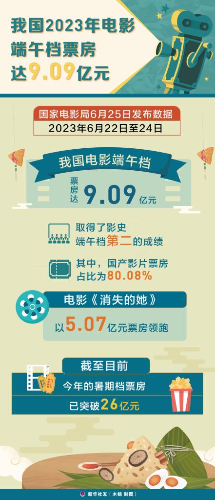 新华社北京6月25日电(记者王鹏)国家电影局25日发布数据,2023年6月22日至24日,我国电影端午档票房达9.09亿元,取得了影史端午档第二的成绩。其中,国产影片票房占比为80.08%。