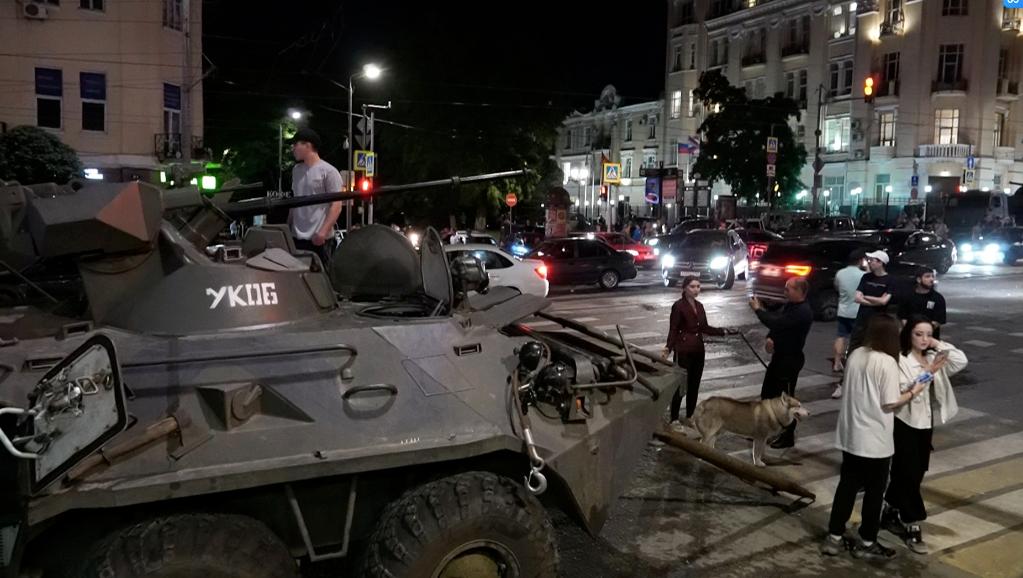 6月24日,在俄罗斯顿河畔罗斯托夫,当地居民站在装甲车旁(视频截图)。新华社发(弗拉基米尔摄)