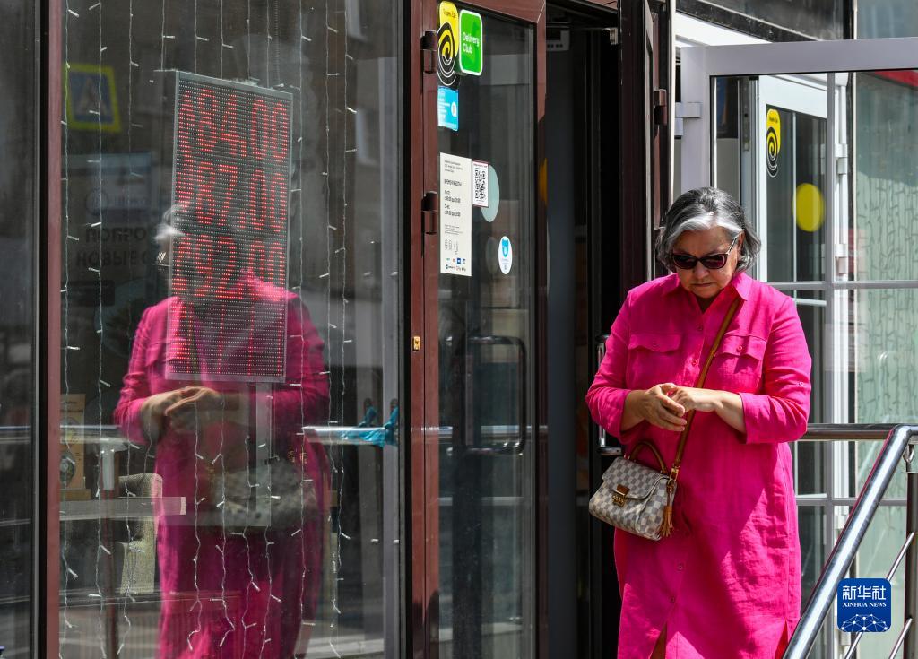 6月26日,在俄罗斯首都莫斯科,行人经过一家外汇兑换点。新华社记者 曹阳 摄