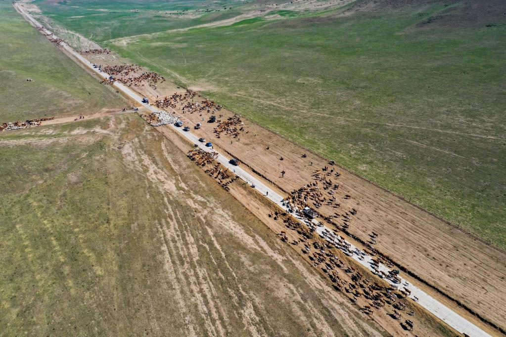 6月15日,牧民们赶着畜群行走在迁徙道路上(无人机照片)。新华社记者 连振摄