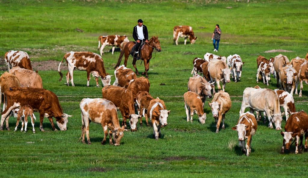 格日乐朝格图骑上骏马聚拢牛群,额尔敦巴特尔和妻子则开着农柴车在前方引路。