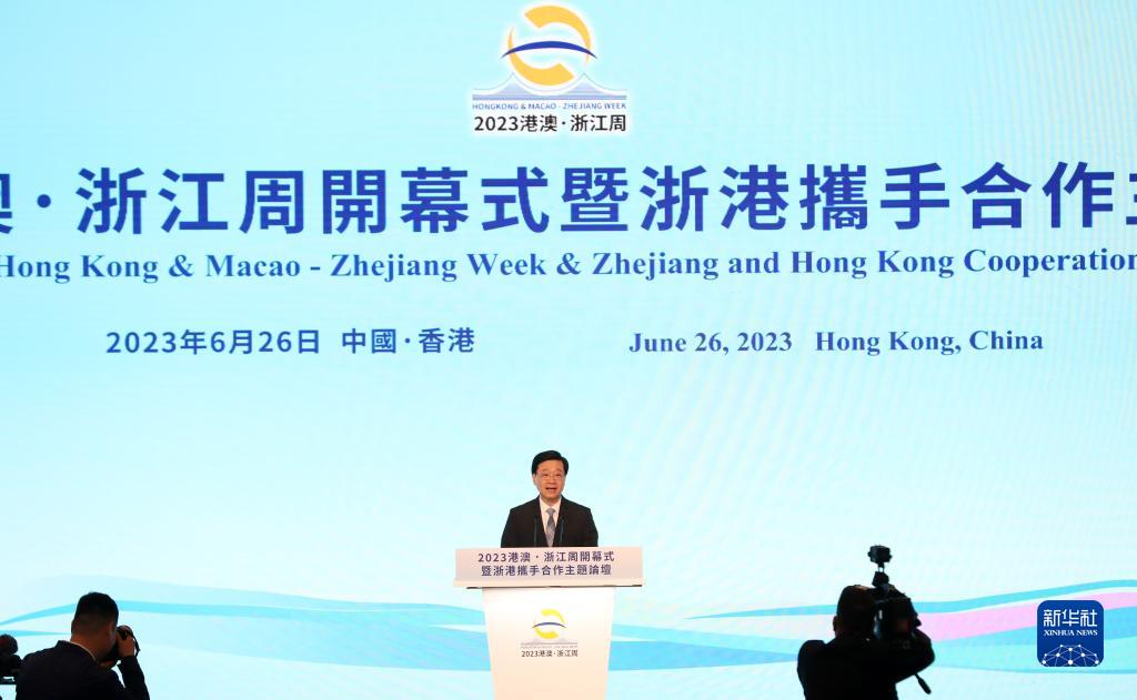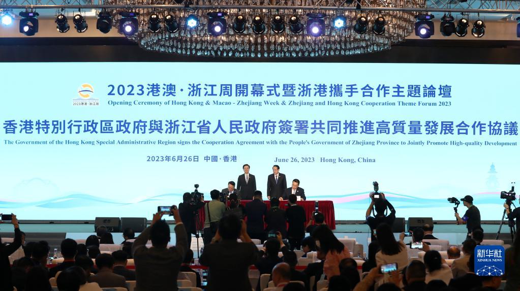 新华社香港6月26日电(梁文佳 章雅昭)2023港澳·浙江周开幕式暨浙港携手合作主题论坛26日在香港举行。浙港双方现场签署共同推进高质量发展合作协议以及3项合作备忘录,同时签约多个合作项目,涉及高端制造、信息技术、教育科技等领域。
