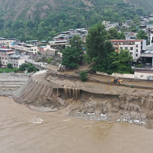 6月27日,救援人员在四川省汶川县绵虒镇板子沟泥石流灾害现场勘查。新华社发