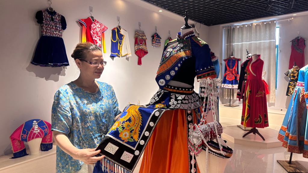 丁智青正展示她设计的民族舞蹈服饰。新华社记者袁慧晶 摄