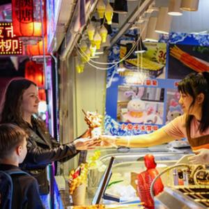 6月27日,俄罗斯游客在珲春市汉唐街夜市选购美食。