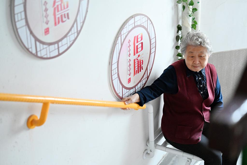 在天津市和平区文化村社区,楼道内加装了扶手和折叠椅便于老人上下楼(2022年10月27日摄)。新华社记者李然摄