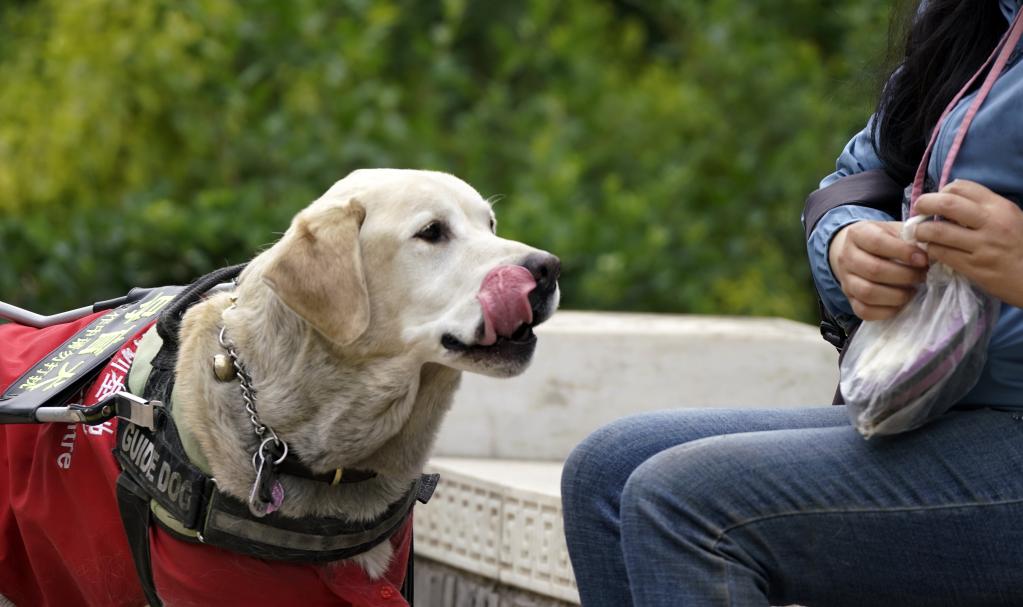 一名因疾病致盲的视障人士准备给导盲犬喂食(2023年5月20日摄)。新华社记者 李欣 摄