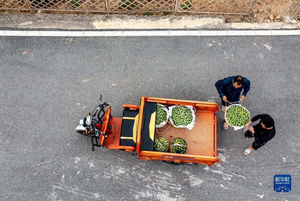 6月28日,在重庆市巫山县曲尺乡柑园村,村民将采摘的巫山脆李装车(无人机照片)。