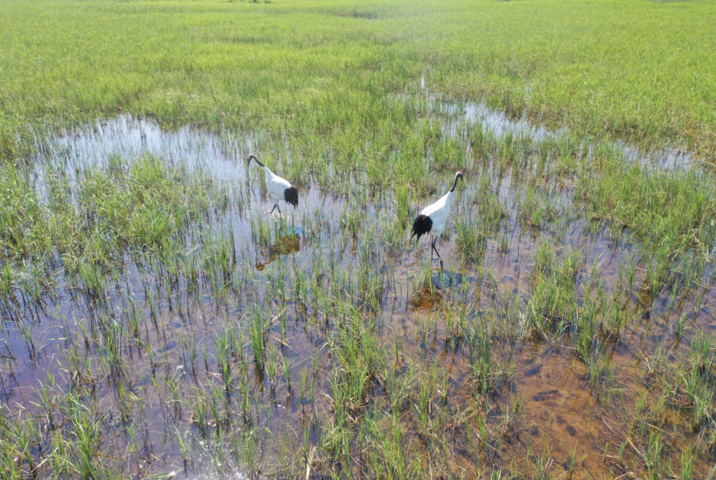 6月16日在科尔沁国家级自然保护区湿地中觅食的丹顶鹤。(梁永峰 摄)