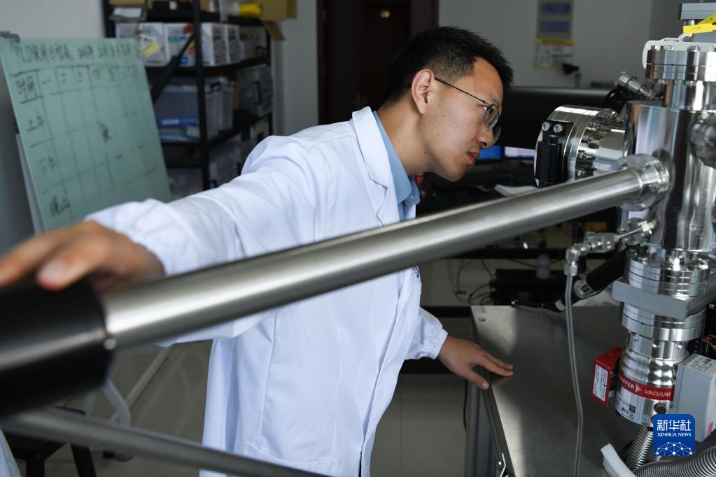 6月28日,在中科院合肥物质科学研究院强磁场科学中心实验室,郝林向脉冲激光分子束外延系统中传送样品。