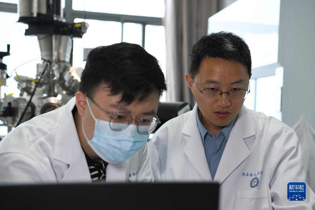 6月28日,在中科院合肥物质科学研究院强磁场科学中心实验室,郝林(右)和学生分析样品的原子级精准可控生长情况。