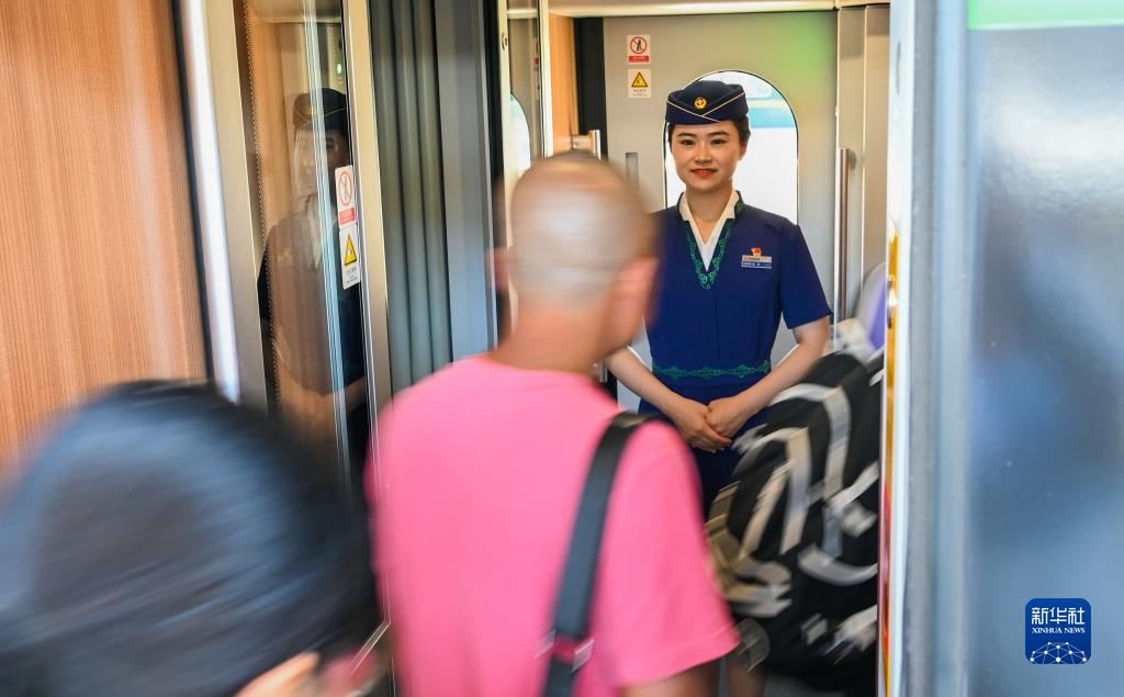6月29日,在呼和浩特东站,呼和浩特客运段西宁车队动车组乘务员在列车上迎接旅客。
