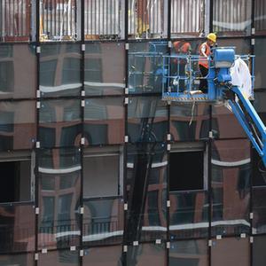 6月29日,在中建三局承建的西安电子科技大学广州研究院项目工地,工人在协助吊装材料。