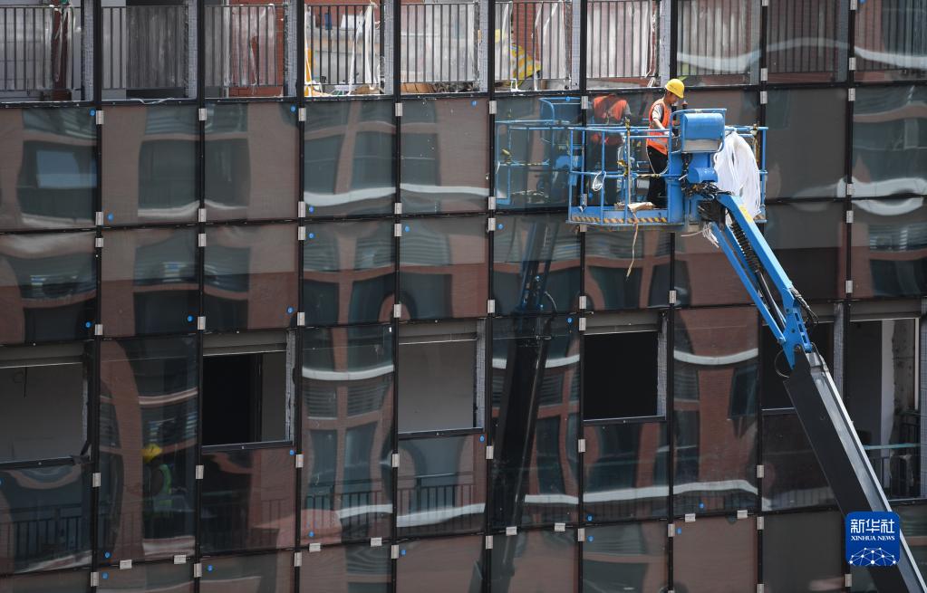 6月29日,在中建三局承建的西安电子科技大学广州研究院项目工地,工人在高空作业。