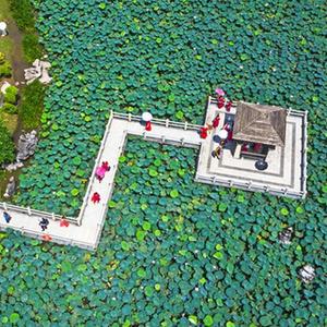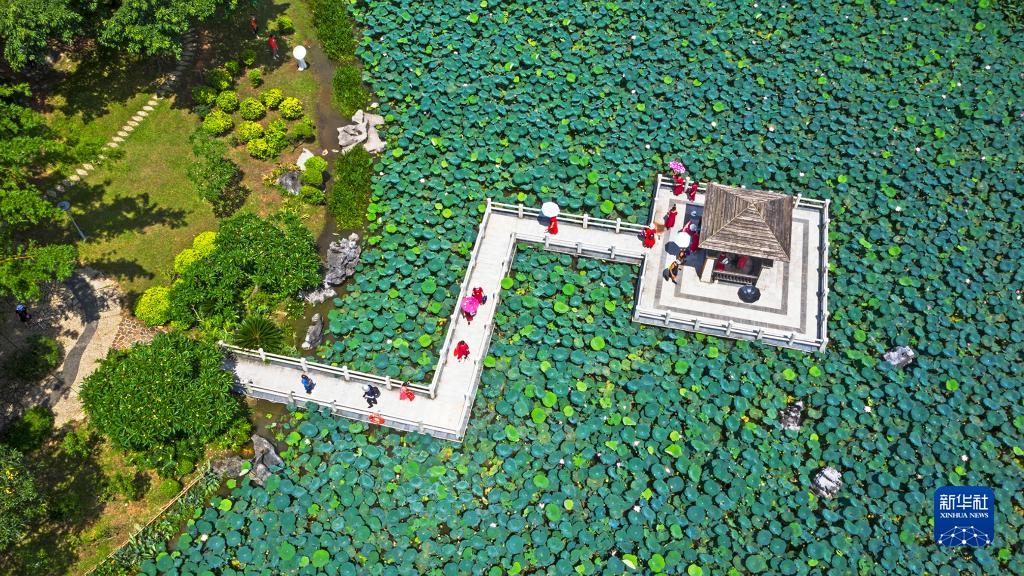 6月28日,游客在广西南宁市狮山公园观赏荷花(无人机照片)。
