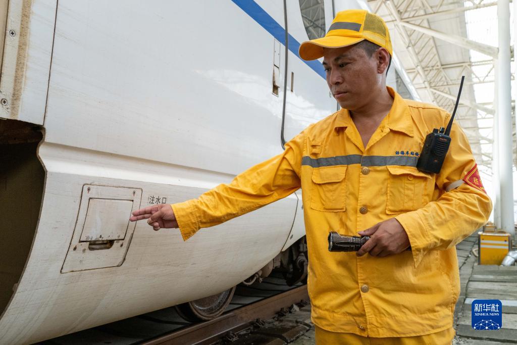 6月29日,温州保洁工区的工人确认高铁列车注水口已关闭。