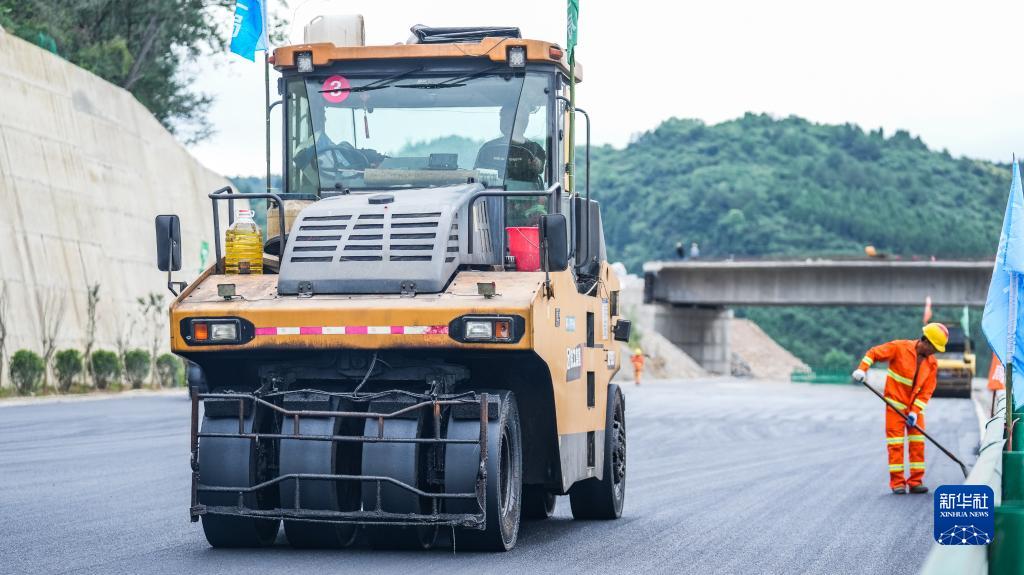 6月29日,中铁十二局工人在贵金古高速公路清池至古蔺段进行路面施工。