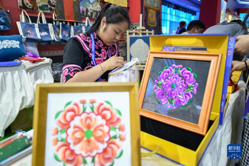 6月29日,在第十九届中国西部国际博览会阿坝展区,参展商在现场展示羌绣。
