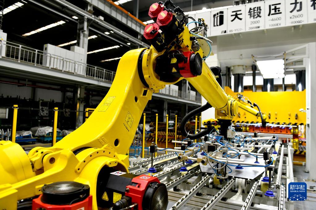 6月29日,山东省日照高新技术产业开发区日照中兴汽车有限公司的工业机器人在冲压汽车配件。新华社记者 郭绪雷 摄