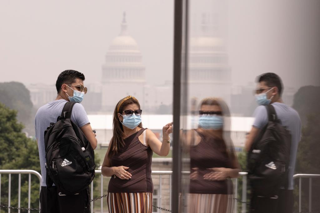 6月29日,在美国首都华盛顿,游客戴着口罩在华盛顿纪念碑游览,远处的国会大厦笼罩在烟雾中。新华社发(亚伦摄)