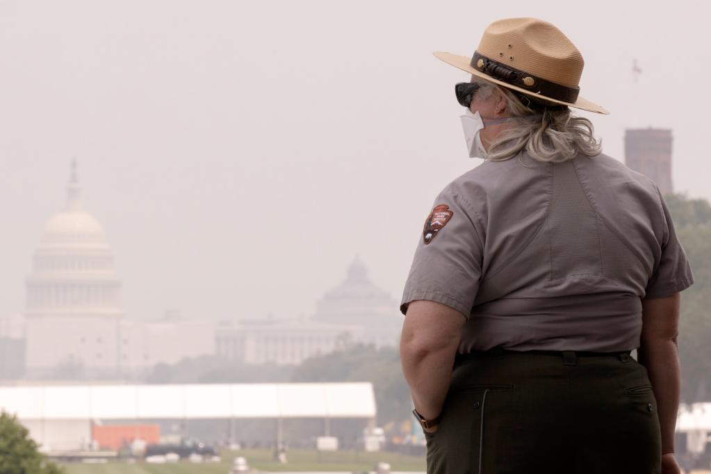 6月29日,在美国首都华盛顿,国家公园的一名员工戴着口罩工作,远处的国会大厦笼罩在烟雾中。新华社发(亚伦摄)