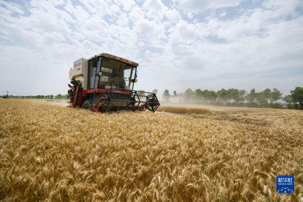 6月2日,在太和县淙祥现代农业种植专业合作社,农机手操作机械设备收割小麦。