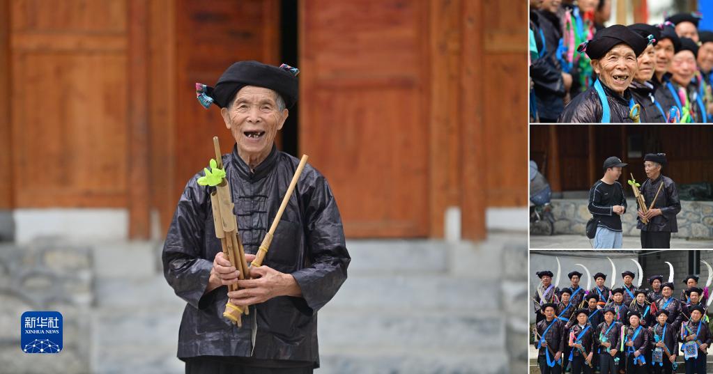 拼版照片:左图为广西融水苗族自治县杆洞乡尧告村91岁的老党员余炳万(2023年6月27日摄);右上图为余炳万在尧告村民俗文化活动中(2019年3月12日摄);右中图为余炳万(右)在指导后辈进行苗族非遗文化保护和发展(2023年6月27日摄);右下图为余炳万(前排右二)和尧告村拉鼓传承人队伍在一起合影(2019年3月12日摄)。