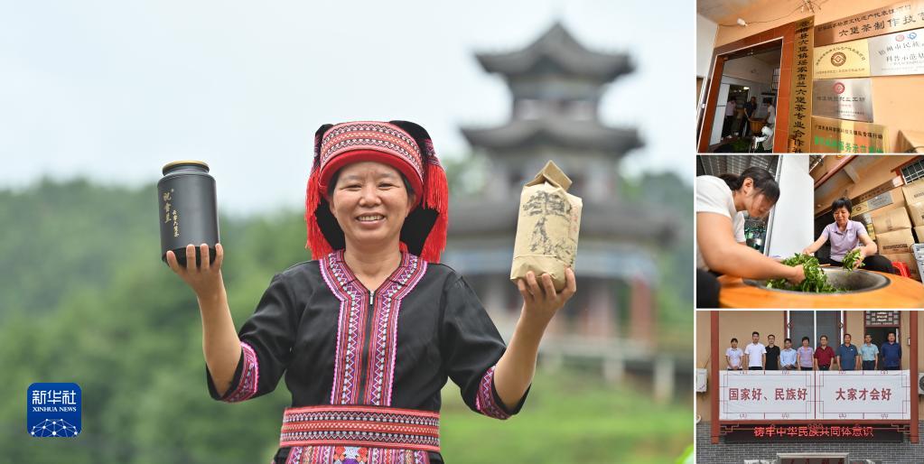 拼版照片:左图为广西梧州市苍梧县六堡镇山坪村52岁的“70后”村党支部书记、村委会主任祝雪兰;右上、中图为祝雪兰在制茶;右下图为祝雪兰(左五)和同事们合影(2023年6月7日摄)。