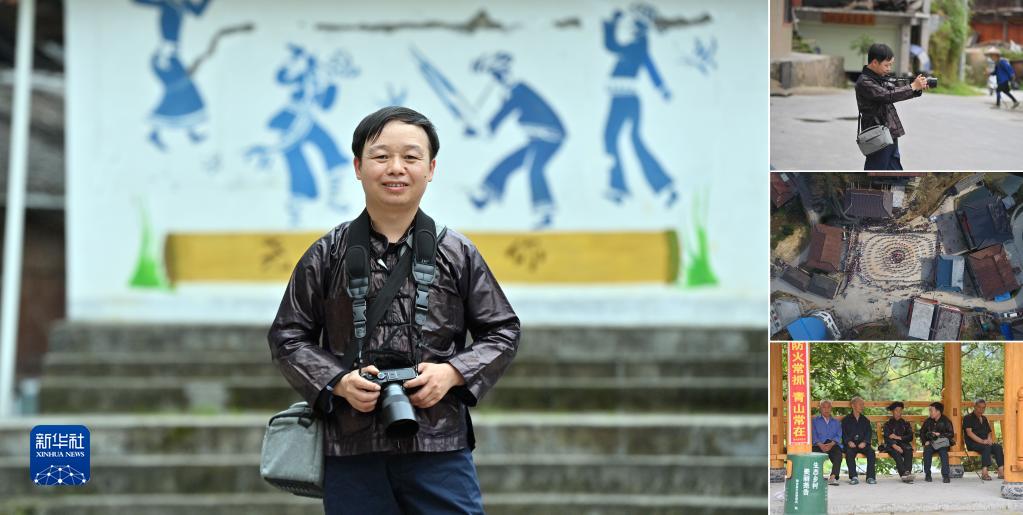 拼版照片:左图为广西融水苗族自治县杆洞乡尧告村43岁的党员梁强(2023年6月27日摄);右上图为梁强在拍摄记录村里的风土人情和民族文化;右中图为尧告村的民族文化活动场面;右下图为梁强(右二)在向老人们了解非遗文化情况。