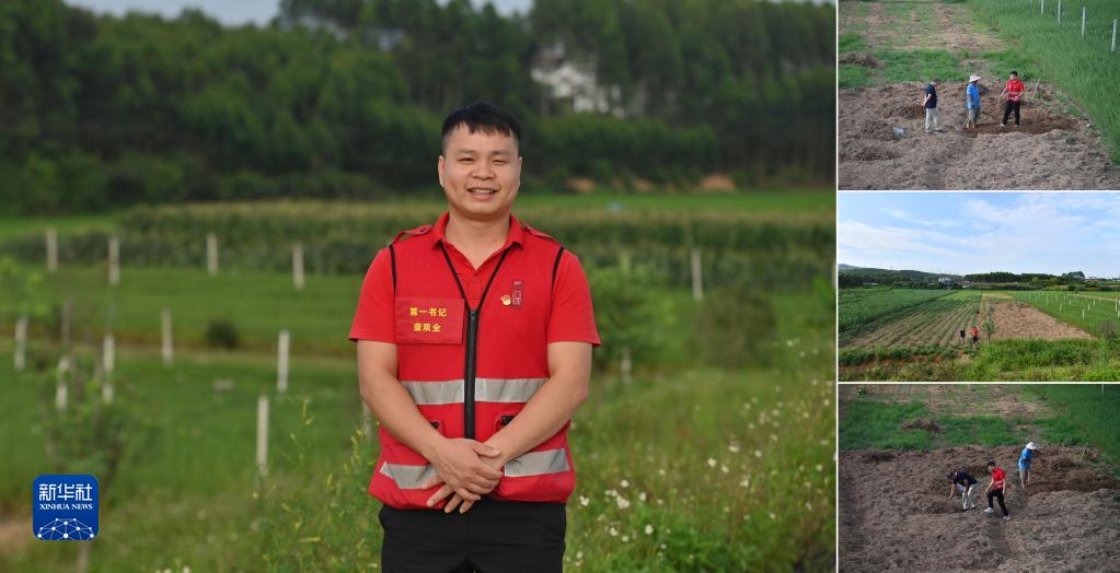 拼版照片:左图为广西鹿寨县鹿寨镇窑上村驻村第一书记、29岁的党员荣双全;右图为荣双全在蔬菜基地查看产业发展情况(照片均摄于2023年6月13日)。